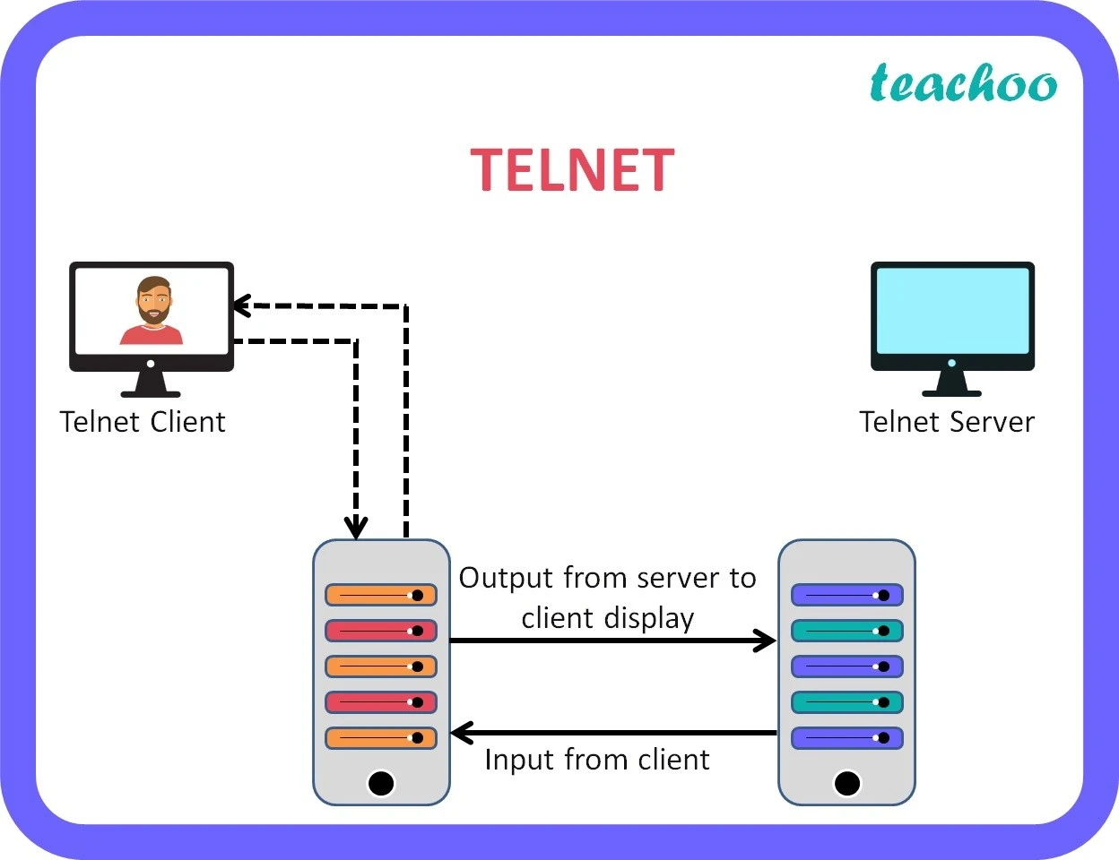 Telnet protokolü esas olarak bir kullanıcının bir bilgisayar vasıtasıyla uzakta bulunan bir başka bilgisayara bağlanmasını sağlar. Bilgisayarlar önceleri karakter tabanlı çalışmaktaydılar. Telnet karakter tabanlı ekranlara login olup çalışma imkanı sağlamaktaydı. Fakat zaman geçtikçe karakter tabanlı ve soğuk ekranlar yerlerini grafiğe dayalı görseli ön plana çıkarılmış ekranlara bırakmıştır. Telnet’in amacı sadece karakter tabanlı sunuculara erişmek değil aynı zamanda terminal emülasyonu yapabilen bir protokol olduğu için önceleri tercih edilmekteydi. Terminal emülasyonu; uzaktaki makineye giriş yapıp, sanki o makinenin başında çalışıyormuş gibi işlemler yapılabilmesidir. Yalnızca terminal modunda grafiksiz erişime hizmet etmektedir.