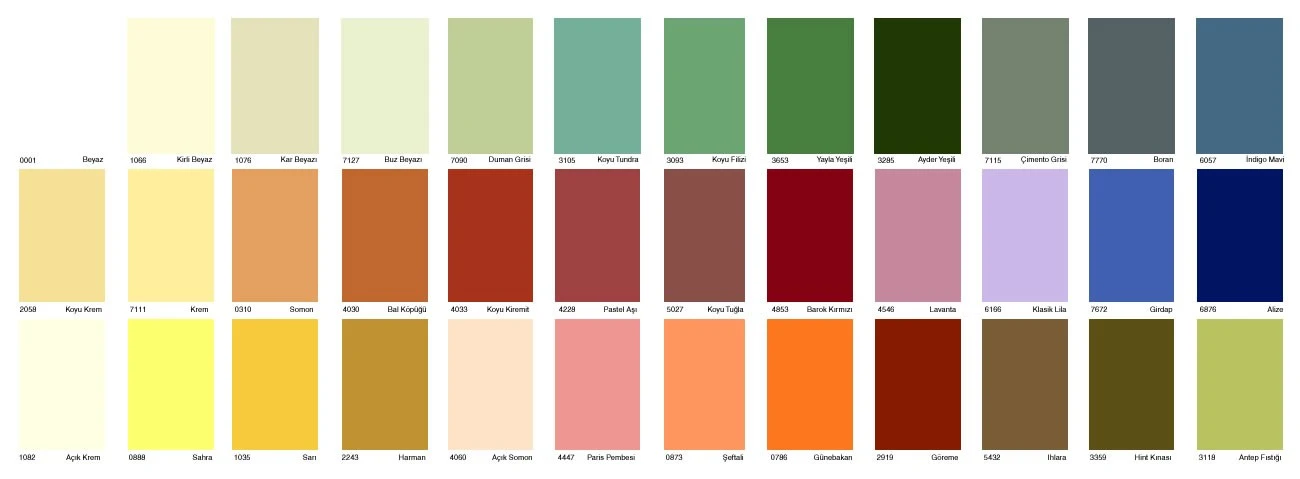 - Beyaz, siyah, mavi, kırmızı, yeşil gibi temel renklerin yanı sıra, pastel tonlar ve canlı renkler de bulunmaktadır.